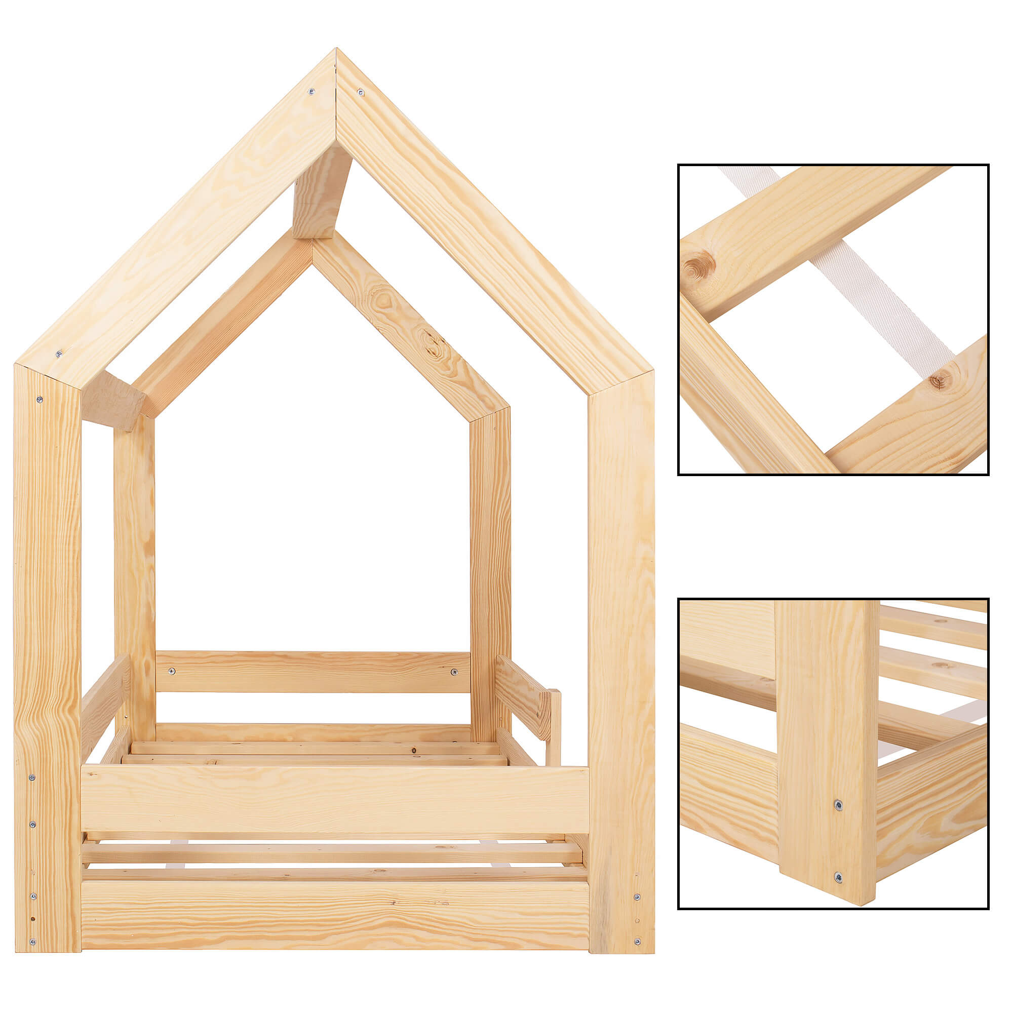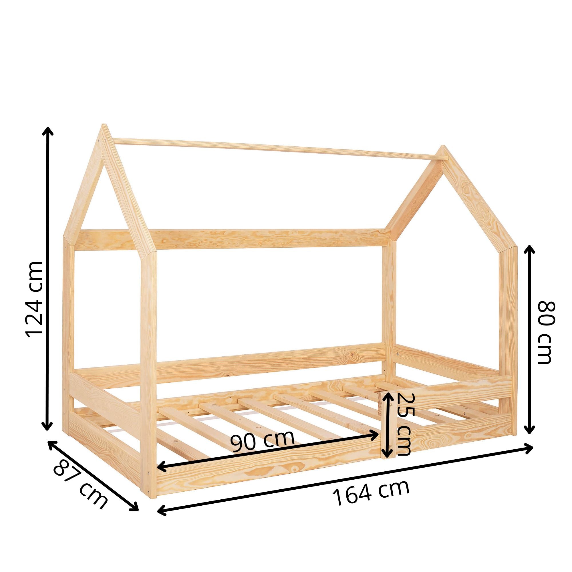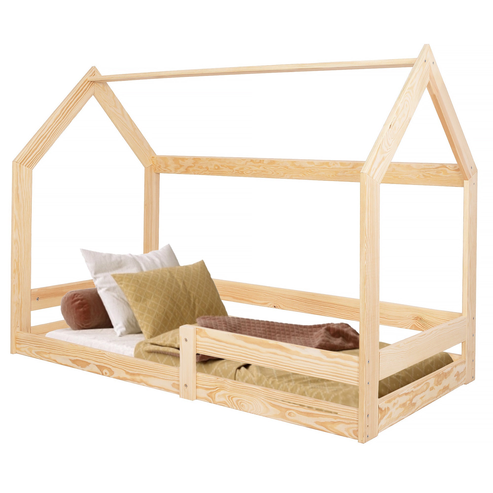 Geef uw kind een unieke en betoverende slaapplek met dit prachtige huisvormige bed. Het ontwerp combineert functionaliteit, veiligheid en een speelse uitstraling, waardoor het perfect is voor de jongste leden van uw gezin. Gemaakt van stevig, natuurlijk hout biedt dit kinderbed een stabiele en duurzame constructie. Het lage frame zorgt ervoor dat uw kleintje gemakkelijk in en uit bed kan stappen, terwijl een beschermende rand voorkomt dat ze tijdens het slapen uit bed rollen.
